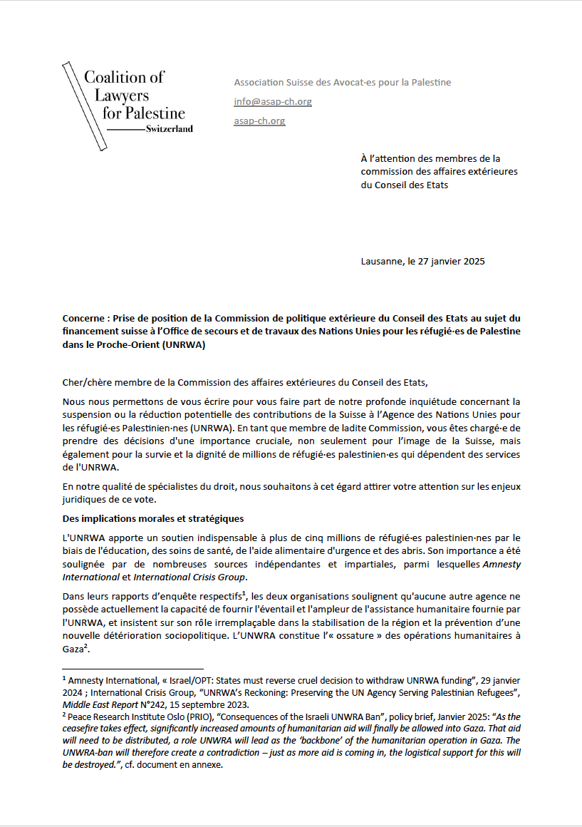 Le 27 janvier 2025, l'Association suisse des avocat·e·s pour la Palestine a adressé un courrier au Conseil des Etats, à propos de sa récente prise de position concernant le financement de l'UNRWA. Ce courrier est accessible ici.